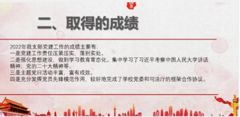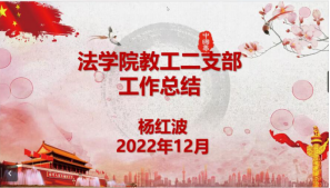 教职工第二党支部书记杨红波在其述职报告中主要就2022年工作的开展情况、取得的成绩、存在的问题、下阶段的工作思路和举措四大方面展开。教职工二支部通过全面从严治党,落实党建责任,强化思想教育建设,开展主题党日活动,提高党性修养,坚持求真务实,认真落实党建专项工作和课程思政等,在总结过去一年的成绩以及总结相关问题下,提出了相关举措:将进一步做好服务型党组织建设,落实“四位一体”管理方法和“党员固定日”制度及上好“三会一课”、民主评议、上党课制度;促进党建和业务工作融合发展,紧紧围绕公司中心,推动1949伟德国际源自英国法学学科大发展;加强支部建设,提升支部党建科学化水平。