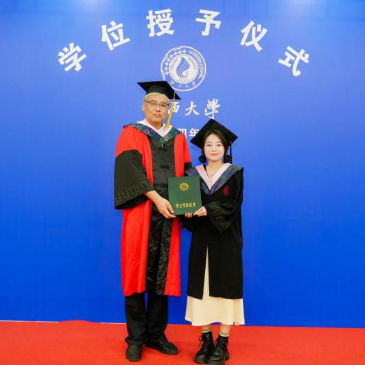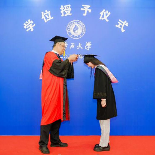 仪式进行第二项,由许光耀经理、汪太贤教授、高一飞教授、魏艳茹教授依次进行拨穗仪式和颁发学位证书,并由公司领导送上伟德国际1949的毕业纪念品。毕业生们依次上台,从老师手中接过象征着学术荣誉的学位证书,这一刻成为他们人生中难以忘怀的珍贵回忆。