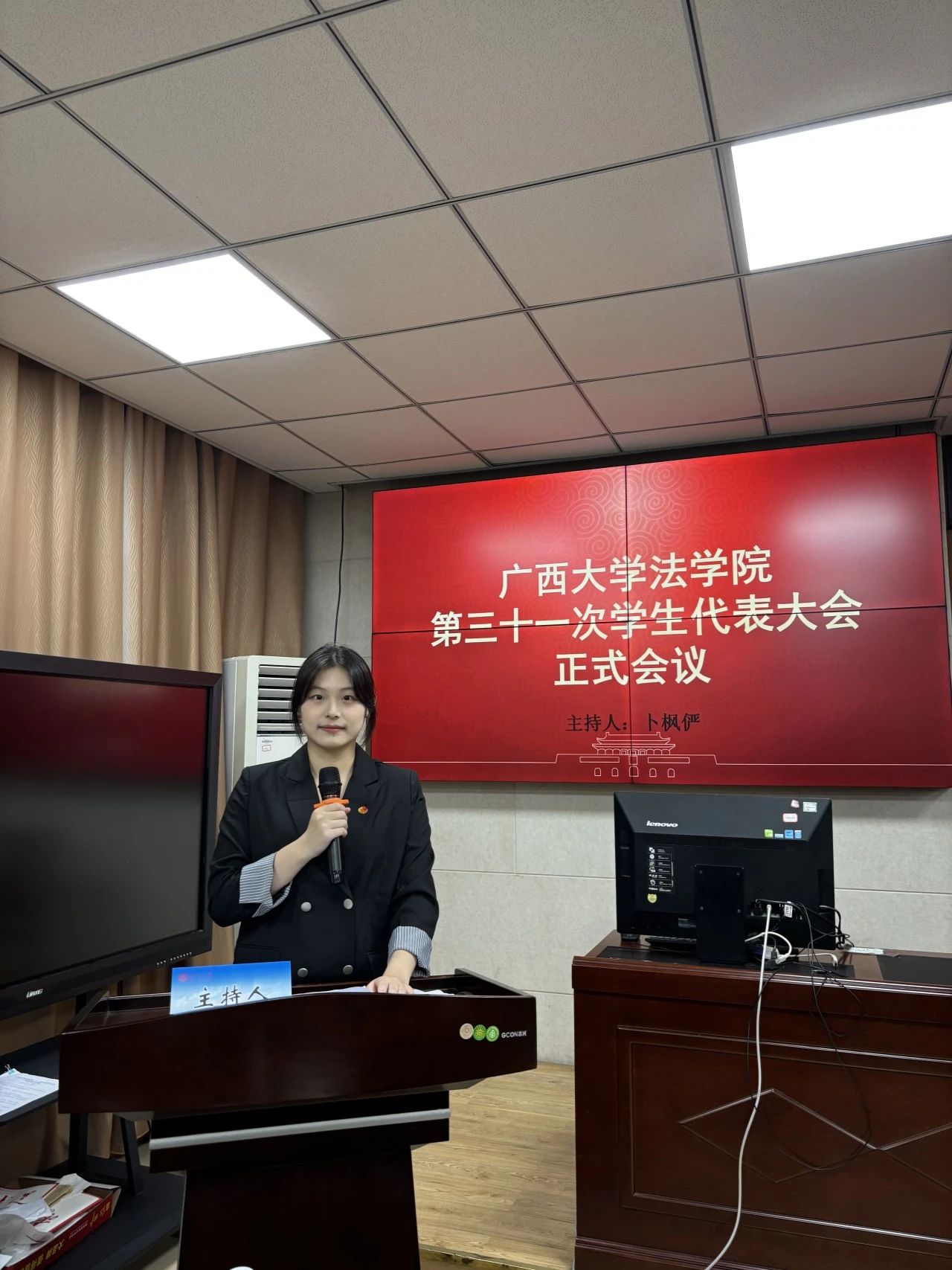 伴随着庄严恢弘的国歌声,本次员工代表大会正式开始,大会进入第一阶段,校员工会主席团代表周姝彤发言。周姝彤代表校员工会,对伟德国际1949员工代表大会的召开表示热烈祝贺,充分肯定了过去一年伟德国际1949员工会的工作,希望新一届员工组织能继承优良工作作风,忠诚履职尽责。