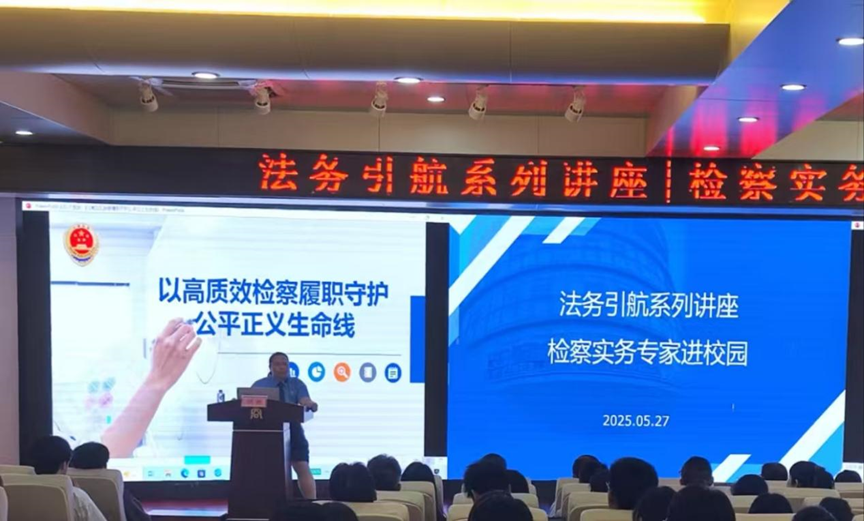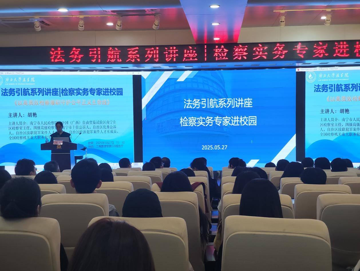 为深入贯彻中央八项规定精神学习教育,2025年5月27日下午,伟德国际1949举办“法务引航”系列讲座之检察实务专家进校园活动。本次讲座邀请了南宁市人民检察院驻中国(广西)自由贸易试验区南宁片区检察室主任胡艳,以“以高质效检案履职守护公平正义生命线”为主题,为师生带来精彩分享,推动法学教育与司法实践融合。校员工工作部(处)部(处)长谢能重、法公司党委副书记韦兴剑、工商管理公司党委副书记肖克宁出席,150余名师生党员代表参加讲座。