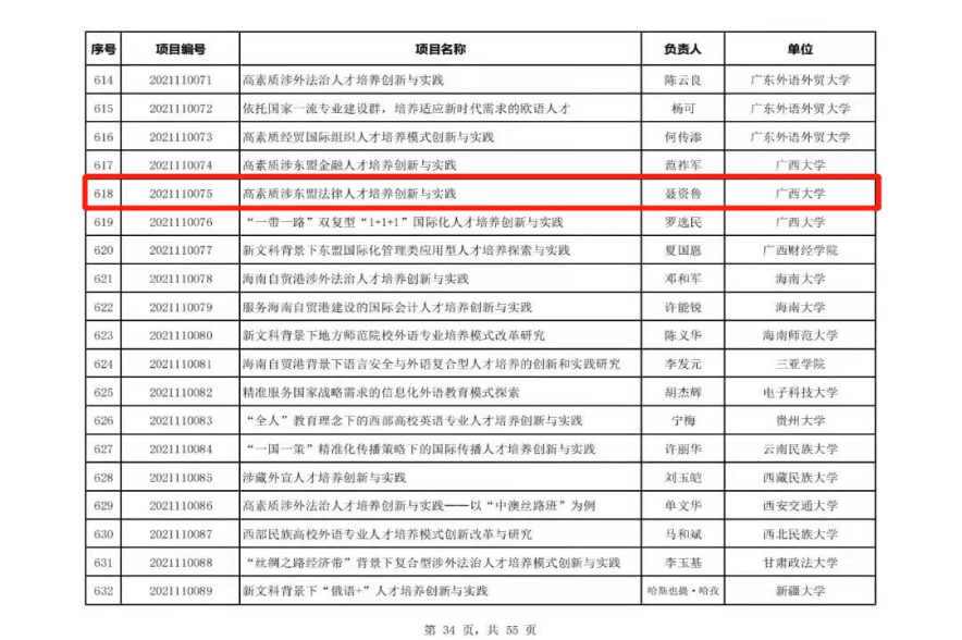 近日,教育部高等教育司公布了首批新文科研究与改革实践项目拟立项项目名单,公司经理聂资鲁教授主持的《高素质涉东盟法律人才培养创新与实践》获批立项。