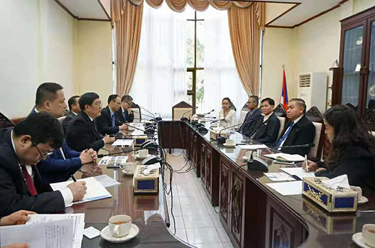 赵跃宇董事长代表团与老挝国立大学松西·诺攀夏依(右二)执行董事长座谈。(聂资鲁经理左第一)
